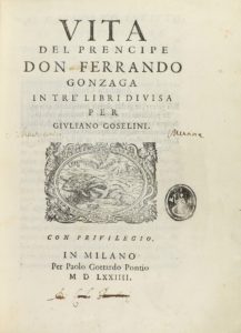 .1574.. LIBRO: .(HISTORIA-BIOGRAFÍA).. .GOSELINI, GIULIANO:. .VITA DEL PRENCIPE DON FERRANDO GONZAGA IN TRE LIBRI DIVISA.. Milano: Paolo Gottardo Pontio, 1574. 4º menor. 8 h. + 455 p. + 1 h. Margen superior algo corto. Marca de caucho en la...