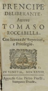 .1633.. LIBRO: .(HISTORIA).. .ROCCABELLA, TOMASO:. .PRENCIPE DELIBERANTE.. Venetia: Apresso Gio. Pietro Pinelli, 1633. 12º. 32 h. + 570 p. Capitales xilográficas. Enc. en pasta española, tejuelo, cortes pintados. Algún pliego semidesprendido, por...