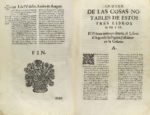 + 150 p. + 134 p. + 150 p. + 14 h. (de 15). Contiene los libros segundo, tercero y cuarto de los anales que siguen a la primera parte. Texto a dos columnas, capitales xilografiadas, apostillas marginales, cul-de-lampe. Cercos de humedad y señal puntual de óxido. En el libro III las pp. 5 a 12 sufren pérdida de soporte en una esquina y afecta el texto. Enc. en pergamino de época, mareado y reparado, para la guarda posterior se ha usado la bula de la cruzada de Inocencio X. En los planos se adivina el escudo de la corona de Aragón. CCPB 32633-X.