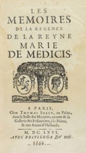 .1666.. LIBRO: .(LITERATURA-MEMORIAS).. .LES MEMOIRES DE LA REGENCE DE LA REYNE MARIE DE MEDICIS.. Paris: Chez Thomas Iolly, 1666. 8º menor. 12 h. + 350 p. + 1 h. Cerco de humedad a lo largo de la obra. Enc. en cartoné.