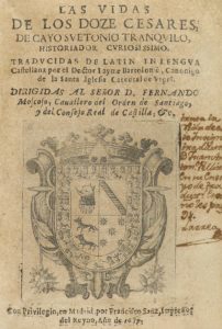 .1679.. LIBRO: .(HISTORIA-ROMA).. .SUETONIO, CAYO:. .LAS VIDAS DE LOS DOZE CESARES. Traducidas del latín en lengua castellana por el Doctor Iaume Bartolomé.. Madrid: Imp. Francisco Sanz, 1679. 8º menor. 8 h. + 229 fol. + 1 h. Portada con grabado...