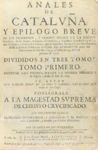 Joseph Llopis; Jayme Surià; Juan Pablo Martí, 1709. 3 vol. en folio menor. I: 9 h. (de 10) + 364 p. + 18 h. Portada y última h. laminadas. II: 11 h. (de 12) + 504 p. + 30 h. III: 11 h. + 655 p. + 26 h. Bellamente ilustr. con capitales, cabeceras y culs-de-lampe xilografiadas, texto a dos columnas y con apostillas marginales. Hojas debilitadas y con algún cerco de humedad, en el tercer vol. más acentuado. Tres vol. enc. en pergamino, semidesprendido en dos de ellos, y con atiguo rastro de humedad el tercero. Esta es una de las obras capitales de la historiografía catalana, escrita por un barcelonés abogado, economista e historiador; fue famoso por su defensa del proteccionismo y de la simplificación fiscal. Participó en la fundación de la Compañía textil Santa Cruz y representó a Catalunya en la Junta Central de Comercio. Durante la guerra de Sucesión apoyó al archiduque Carlos de Austria. Primera edición. CCPB 198279-6. Palau 87471.