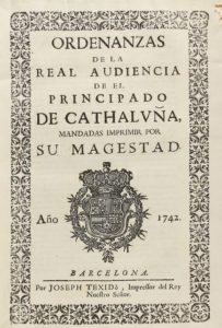 escudo real grabado en madera. Capitales y culs-de-lampe xilografiadas. Texto a dos columnas con apostillas marginales. Enc. en pergamino de la época con título rotulado en el lomo. Muy buen ejemplar. Edición original. En 1716, Felipe V, instauró un nuevo tribunal dentro del Principado, para las causas tanto civiles como criminales, y también para lo gubernativo. Palau 202661.