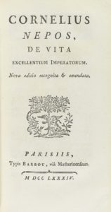 .1784.. LIBRO: .(HISTORIA).. .NEPOS, CORNELIUS:. .DE VITA EXCELLENTIUM IMPERATORUM.. Parisiis: Typis Barbou: 1784. 8º menor. 350 p. + 1 h. Frontis grabado. Enc. en plena piel, hilos, cantos y cejas dorados, tejuelo, lomera cuajada, cortes dorados.
