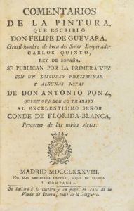 .1788.. LIBRO: .(HISTORIA).. .GUEVARA, FELIPE DE:. .COMENTARIOS DE LA PINTURA QUE ESCRIBIO.... Con notas de Antonio Ponz. Madrid: Geronimo Ortega, hijos de Ibarra y Compañia, 1788. 8º menor. 1 h. + XIV + 254 p. Varios cercos de humedad y algo corto...