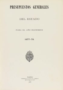 ambos planos, hilos, cantos y cejas, cortes dorados, lomera cuajada, nervios. Escudo en el plano anterior. [Más:] .PRESUPUESTOS... 1878-79. .Id. Enc. en plena piel, hierros secos y dorados en ambos planos, enc. deteriorada, cajo anterior completamente sesgado. Escudo en el plano anterior. [Más:] .PROYECTO DE LEY DE PRESUPUESTOS PARA 1880-81. PRESENTADO A LAS CORTES POR EL MINISTRO DE HACIENDA SEÑOR MARQUÉS DE OROVIO. .Id.: Imp. Vda. e hijos de J. Antonio Garcia, 1880. 167 p. Enc. en plena piel, cenefa dorada en ambos planos, con escudo en el anterior, hilos cantos y cejas dorados. Cortes dorados, nervios, cajo anterior parcialmente sesgado. Dos presupuestos completos y un proyecto de ley presupuestaria que abarca los primeros años del reinado de Alfonso XII y justo después de la guerra carlista.