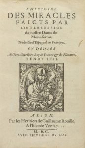 .1600.. LIBRO: .(MONTSERRAT).. .HISTOIRE DES MIRACLES FAICTS PAR L´INTERCESION DE NOSTRE DAME DE MONT-SERRAT.. Lyon: Par les Heritiers de Guillaume Rouille, 1600. 8º menor. 12 h. + 698 p. +12 h. Cabeceras y xilografía en la portada. Enc. en...
