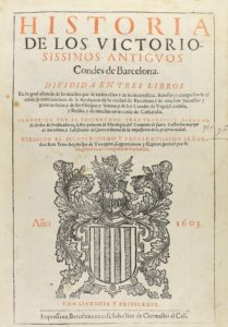 .1603.. LIBRO: .(HISTORIA-BARCELONA).. .DIAGO, F. FRANCISCO:. .HISTORIA DE LOS VICTORIOSISSIMOS ANTIGUOS CONDES DE BARCELONA.. Barcelona: Sebastián de Cormellas, 1603. Folio. 8 h. + 318 fol. + 10 h. Portada a dos tintas con el escudo de los condes...