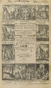 .1617.. LIBRO: .(MONTSERRAT).. .OLIVIER, MATHIERV:. .HISTOIRE DE L´ABBAYE ET DE MIRACLES DE NOSTRE DAME DE MONTSERRAT.. Lyon: Chez les heritiers de Guillaume Roville, 1617. 8º. 19 p. + 10 h. + 599 p. + 7 h. Portada con orla de viñetas grabadas y...