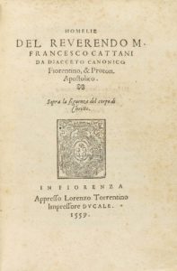 .1559.. LIBRO: .(RELIGION).. .CATTANI, FRANCESCO:. .HOMELIE DEL REVERENDO.... Fiorenza: Appresso Lorenzo Torrentino, 1559. 4º menor. 4 h. + 263 p. + 4 h. Capitales xilográficas y marca xilográfica del impresor en la última hoja. Ligera señal de...