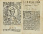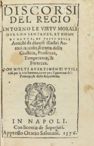 .1576.. LIBRO: .(MORAL-FILOSOFÍA).. .DISCORSI DEL REGIO INTORNO LE VIRTU MORALI QUE CON SENTENZE ET ESEMPI DI DETTI ET FARRI.... Napoli: Appresso Oratio Saluiani, 1576. 8º menor. 16 h.+ 87 fol. + 2 h. Retrato xilográfico. Finas galerías y algún...
