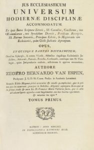 .1791.. LIBRO: .(HUMANIDADES).. .VAN ESPEN, ZEGERO BERNARDO:. .JUS ECCLESIASTICUM UNIVERSUM HODIERNAE DISCIPLINAE ACCOMMODATUM.... Matriti: Typ. Raimundi Ruiz, 1791. 3 vol. en folio menor. I: 12 h. + 572 p. II: 1 h. + 527 p. III: 11 h. + 336 p. + 303...