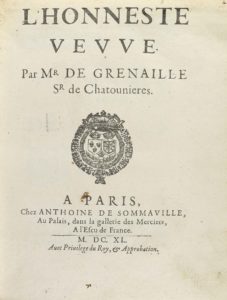 primeras hojas bien restaurado. Aguna antigua anotación a tinta. Enc. en pergamino reciente, lomera rotulada. Grenaille fue un autor prolífico que explora en sus argumentos la moral y la ´libertad´ a la que se ven abocadas las mugeres de su tiempo. Primero tuteladas por un padre y más tarde por un marido o por Dios, hasta que enviudan y recuperan una libertad y capacidad de decisión no experimentadas antes. Esta es la tercera parte de una trilogía (la honesta hija, la honesta casada, son los títulos anteriores). Dedicada a Charlotte de Castilla, dos veces viuda y, según el autor, ejemplo de la virtud y honestidad de las viudas, aunque en su tiempo fue acusada de cierta moral relajada.
