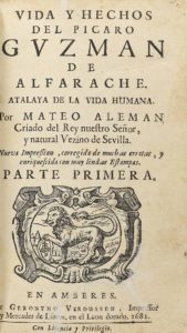 .1681.. LIBRO: .(LITERATURA).. .ALEMAN, MATEO:. .VIDA Y HECHOS DEL PICARO GUZMAN DE ALFARACHE. ATALAYA DE LA VIDA HUMANA.. Amberes: Imp. Geronymo Verdussen, 1681. 2 tomos en un vol. en 8º. I: 7 h. + 299 p. + 2 h. + 8 grabados (en las pp. 19, 43, 67,...
