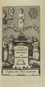 .1690 ca.. LIBRO: .(LITERATURA).. .CHARRON, PIERRE:. .DE LA SAGESSE, TROIS LIVRES.. Leide: Iean Elsevier, s.a. 12º. 12 p. + 621 p. + 6 h. Ligera señal de óxido. Bonita tipografía. Enc. en piel, nervios, cantos y cejas. Frontis grabado. Ex-libris...