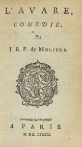 capitales y culs-de-lampe xilográficas. Portada a dos tintas con marca tipográfica. Esta obra incluye: L´Avare (1683); George Dandin (1684); L´imposteur ou le tartuffe (1684); Le Bourgeois gentilhomme (1688). Cada parte con frontis calcográfico y portada propia. Pequeña galería en el margen interior en algunas p. de la segunda mitad de la obra. Enc. en media piel.
