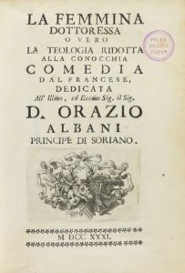 .1731.. LIBRO: .(LITERATURA).. .LA FEMMINA DOTTORESSA.. S.l.n.imp., 1731. 8º menor. 191 p. Frontis grabado y grabado calcográfico en la portada. Enc. en pergamino. Marca de caucho.
