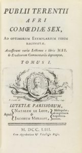 .1753.. LIBRO: .(LITERATURA CLÁSICA).. .TERENTII AFRI, PUBLII:. .COMOEDIAE SEX.. Lutetiae Parisiorum: Apud Natalem le Loup y Jacobum Merigot, 1753. 2 vol. 8º menor. I: Frontis grabado + XXX + 254 p. y grabados fuera del texto. II: 2 h. + 364 p. + 2...