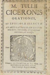 .1759.. LIBRO: .(ORATORIA-CLÁSICOS).. .CICERONIS, M. TULLII:. .ORATIONES ET EPISTOLAE SELECTAE.. Cervariae: Ex Officina Antoniam Ibarra viduam, 1759. 12º. 412 p. Corto de márgenes. Enc. en pergamino reciente. Palau da noticia de varias ediciones...