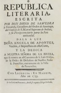 .1759.. LIBRO: .(LITERATURA).. .SAAVEDRA Y FAXARDO, DIEGO DE:. .REPUBLICA LITERARIA, ESCRITA POR.... Madrid: Imp. Angela de Apontes (Vecina e Impressora en esta Corte), 1759. 8º mayor. 6 h. + 60 p. + 119 p. Palau 283513. [Sigue:] .VAZQUEZ, JOSEPH:...