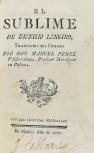 .1770.. LIBRO: .(LITERATURA).. .LONGINO, DIONISIO:. .EL SUBLIME.. Traducción del griego por Manuel Perez Valderrabano. Madrid: s. imp., 1770. 8º menor. 36 h. + 246 p. Portada con restauración y reconstrucción. Enc. en pasta española, tejuelo,...