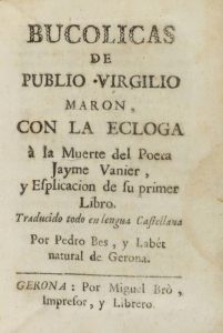 .1771.. LIBRO: .(LITERATURA CLÁSICA).. .VIRGILIO, PUBLIO:. .BUCOLICAS.. Traducción en prosa castellana por Pedro Bes y Labet. Gerona: Miguel Brò, 1741 (en la carta preliminar). 8º menor. 18 h. + 288 p. Enc. en pergamino de época, lomera...