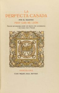 .1930.. LIBRO: .(LITERATURA-BIBLIOFILIA).. .LEÓN, FRAY LUIS DE:. .LA PERFECTA CASADA.. Barcelona: Casa Miquel-Rius, 1930. 8º mayor. IX + 225 p. Ilustr. por J. Triadó. Enc. en plena piel, lomera cuajada, hierros dorados en ambos planos, cantos y...