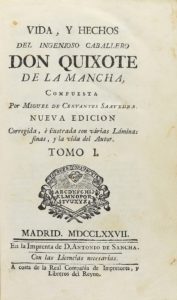 .1777.. LIBRO: .(CERVANTINTA).. .CERVANTES SAAVEDRA, MIGUEL DE:. .VIDA, Y HECHOS DEL INGENIOSO CABALLERO DON QUIXOTE DE LA MANCHA.. Madrid: Imp. Antonio de Sancha, 1777. 4 vol. en 8º. I: Frontis grabado + 160 + 427 p. y 12 lám. grabadas. II: 2 h. +...