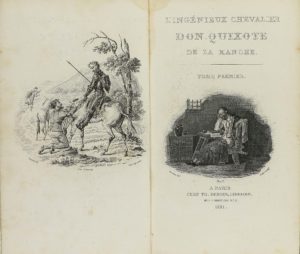 .1821.. LIBRO: .(CERVANTINA).. .[CERVANTES, MIGUEL DE:].. .L´INGÉNIEUX CHEVALIER DON QUIXOTE DE LA MANCHE.. Paris: Chez Th. Desoer, 1821. Cuatro tomos en 2 vol. en 8º menor. I: 1 h. + Frontis grabado + portada + VIII + 330 p. + 1 lám. y 1 h. +...
