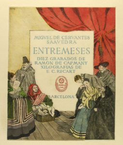 .1947.. LIBRO: .(BIBLIOFILIA-CERVANTINA).. .CERVANTES SAAVEDRA, MIGUEL DE:. .ENTREMESES.. Sabadell: Imp. Juan Sallent, 1947. 4º mayor. Impreso a dos tintas. 168 p., 2 h. Ilustr. con 10 láminas de aguafuertes de CAPMANY (2 a color). Viñetas y...
