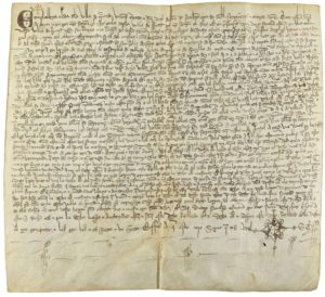 .1414.. MANUSCRITO: .(ALBERCAS).. .CONFIRMACIÓN DE SENTENCIA.. Pergamino de 23 x 21 cm. Manuscrito con signum notarial que es copia autorizada por Diego Sanchez, escribano. Caligrafía cancelleresca.