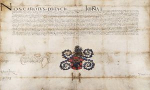 privilegio militar confirmando las armas del escudo, dado por el rey a favor de Jacobo Perez de Nueros. El encabezado del documento reza: ´NOS CAROLUS ·DI·FA·CLe· Romanorum Imperator semper augustur, IOAN[N]AE ins mater et Idem Carolus dei gratia Reges Castelle...´ Lleva la firma mansucrita de Carlos I. Aunque conserva el cordón en la plica, ha perdido el sello colgante. Alguna pequeña falta restaurada, la mayor afecta la cápsula del tratamiento con la firma del secretario. Aplanado y conservado profesionalmente.