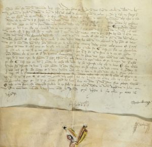 quantos esta carta de ordenamiento vieren como yo Don Pedro por la gracia de Dios rey de Castiella...´ por la que se ordena a los hombres armados, a caballo o a pie, que no tomen a su costa ni vino, ni pan, ni fruta ni ninguna otra cosa, bajo condena de treinta días ´en la cadena´. Firmado el 20 de julio de 1389 (era hispánica), por lo que es el año 1351 del calendario actual. Firmas de secretariado y una firma que podría ser de mano del rey, reza ´El rey´.