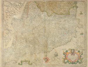 .1628 ca.. MAPA: .(CATALUNYA).. .MERCATOR; HONDIUS:. .CATALONIAE PRINCIPATUS DESCRIPTIO NOVA.. Mapa grabado al cobre, coloreado. 40 x 51 cm. Ligero coloreado, monstruos marinos, lleva rosa de los vientos y dos cartelas en la parte inferior. Papel...