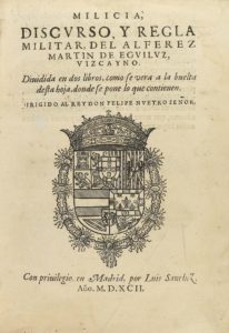 .1592.. LIBRO: .(MILITARIA).. .EGUILUZ, MARTIN DE:. .MILICIA, DISCURSO, Y REGLA MILITAR, DEL ALFEREZ MARTIN DE EGUILUZ, VIZCAYNO. Dividida en dos libros, como se vera a la vuelta de esta hoja, donde se pone lo que contienen.. Madrid: por Luis...