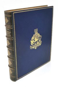 Enc. firmada por BRUGALLA en plena piel con hilos dorados en ambos planos, cantos y cejas, corte superior dorado, reproducción en el plano anterior de uno de los grabados de Ricart a modo de superlibris dorado, nervios, florones en la lomera ; presentado en una petaca de cartoné papel al agua algo rozada, con perfiles de piel.