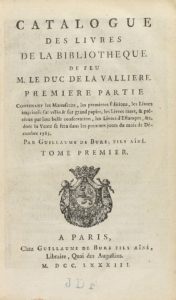 1783. — LIBRO : (BIBLIOGRAFÍA). — BURE, GUILLAUME DE : — CATALOGUE DES LIVRES DE LA BIBLIOTHEQUE DE FEU M. LE DUC DE LA VALLIERE. — Paris : Chez Guillaume de Bure fils Aîné, 1783. 2 vol. en 8º mayor. I : 2 h. + LXIV p. + 71 p. + 602 p. y...