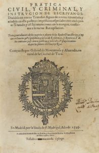 1595. — LIBRO : (DERECHO). — MONTERROSO Y ALVARADO, GABRIEL DE : — PRATICA CIVIL, Y CRIMINAL, Y INSTRUCION DE ESCRIVANOS : DIVIDIDA EN NUEVE TRATADOS. AGORA DE NUEVO EMENDADA, Y AÑADIDA EN ESTA POSTRERA IMPRESSION... — Madrid : biuda (sic)...