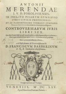 1625. — LIBRO : (DERECHO CANÓNICO). — MERENDAE, ANTONII : — CONTROVERSIARUM IURIS LIBRI SEX. — Venettis : Apud Haeredem Damiani Zenarii, 1625. Folio menor. Portada con bella marca calcográfica. Cabeceras, capitales y culs-de-lampe...