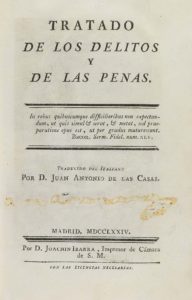 1774. — LIBRO : (DERECHO). — BECCARIA : — TRATADO DE LOS DELITOS Y DE LAS PENAS. — Trad. Juan Antonio de las Casas. Madrid : Imp. Joachin Ibarra, 1774. 8º. Frontis grabado + 2 h. + XXVI + 255 p. [Sigue:] RESPUESTA A UN ESCRITO INTITULADO...