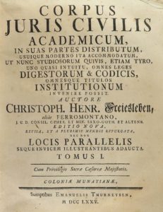 1775. — LIBRO : (DERECHO). — FREIESLEBEN, CHRISTOPH. HENR. : — CORPUS JURIS CIVILIS ACADEMICUM, IN SUAS PARTES DISTRIBUTUM... — Coloniae Munatianae [Basilea] : Sumptibus Emanuelis Thurneysen, 1775. 2 vol. 4º. I : 3 h. + 1794 col. + 19 h. II...