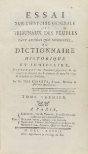 1778-1784. — LIBRO : (DERECHO). — ESSARTS, M. DES : — ESSAI SUR L´HISTOIRE GÉNÉRALE DES TRIBUNAUX DES PEUPLES TANT ANCIENS QUE MODERNES, OU DICTIONNAIRE HISTORIQUE ET JUDICIAIRE. — Paris : Imp. Durand, Nyon, Merigot, 1778-1784. 9 vol. en...