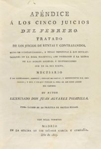1803. — LIBRO : (DERECHO). — ALVAREZ POSADILLA, JUAN : — APÉNDICE Á LOS CINCO JUICIOS DEL FEBRERO. TRATADO DE LOS JUICIOS DE RENTAS Y CONTRABANDOS... — Madrid : En la oficina de los señores García y Compañía, 1803. 8º mayor. XXX + 407...