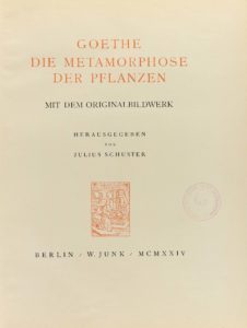 1924. — LIBRO : (FACSÍMIL-BOTÁNICA). — SCHUSTER, JULIUS : — GOETHE DIE METAMORPHOSE DER PFLANZEN. MIT DEM ORIGINALBILDWERK HERAUSGEGEBEN. — Berlin : W. Junk, 1924. Folio. Retrato + 145 p. + 1 h. + XVI lám. cromolitográficas. Portada a dos...