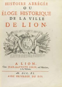 1711. — LIBRO : (HISTORIA DE LIÓN-FRANCIA). — HISTOIRE ABRÉGÉE OU ÉLOGE HISTORIQUE DE LA VILLE DE LION. — Lion : Jean-Baptiste Girin, 1711. 4º. 9 h. + 201 p. + 76 p. + 200 h. Portada a dos tintas con bella marca calcográfica por Bouchet....