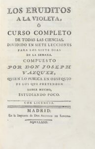 1772. — LIBRO : (LITERATURA). — VAZQUEZ, JOSEPH [pseud. de JOSÉ CADALSO] : — LOS ERUDITOS A LA VIOLETA, Ó CURSO COMPLETO DE TODAS LAS CIENCIAS. DIVIDIDO EN SIETE LECCIONES PARA LOS SIETE DIAS DE LA SEMANA. — Madrid : Imp. Antonio Sancha,...