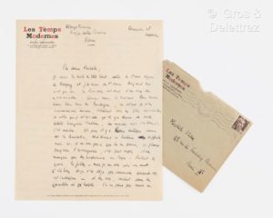 PONTALIS Jean-Bertrand (1924-2013). Philosophe et psychanalyste français. L.A.S. à Michèle Vian, [Rome], Dimanche 15 septembre [1957]. 2 pages in-4, en-tête de la revue Les Temps Modernes. Belle lettre de Pontalis, pleine d’humour, confessant l’ennui qu’il éprouve à Rome. « [ ] Les Romains ont cessé d’un coup de m’émerveiller. Comme nous, ils trainent leur ennui dans leur bois de Boulogne, au début je n’en reconnaissais aucun, c’étaient tous des êtres miraculeux et voilà que je m’aperçois qu’il y a aussi de sales petits bourgeois italiens ( ) c’est moche. Et puis il y a Rome antique comme dit le Bachelier, décidément de lecture difficile. Mais ça je ne sais pas ce que tu en penses, ça flaira toujours l’escroquerie, c’est fait exprès, il ne manque que des bonshommes en toge Restent les gosses, les filles - mais je ne sais pas un mot d’italien et ça c’est déjà pas commode quand on est indigène [ ] Et puis bien sûr il y a les curés, de quoi inspirer Boris [Vian] pour la vie. Une marchande de journaux me disait tout à l’heure qu’elle avait à la fois la ruse des prêtres et celle des communistes. [ ] »