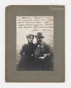 [ALBENIZ] SANSONI Clara (1891- ?) Pianiste espagnole Belle photographie noir & blanc, dédicacée et signée par Clara Sansoni, contrecollée sur carton vert gaufré. Ce cliché représente Clara Sansoni et son maître le pianiste Isaac Albeniz posant côte à côte. Emouvante dédicace « A Monsieur Mangeot pour lui rappeler mon cher Maître vénéré dont le cœur était aussi grand que son talent. Son unique Elève inconsolable », (17 x 22 cm, hors cartonnage : 10,7 x 15,5 cm). Collection de Monsieur M et au propriétaire actuel par succession.