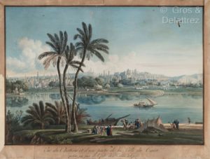 [Gravure]. Louis François CASSAS (1756-1828). Vue du Chateau et d’une partie de la ville du Caire prise en face de l’Isle de Rodda à Gizé L. F. Cassas f. 55 x 79 cm (tr. c.) et 65 x 87 cm (f.). Eau-forte au trait aquarellée avec reprise de plume et rehauts de gouache. Elève de Vien et de Lagrenée le Jeune, il rapporta de ses voyages des dessins, qu’il grava (Hollande, 1776). Il collabora aux Voyages pittoresques de l’abbé de Saint-Non (Sicile) et de Choiseul-Gouffier (Syrie, 1784-1787) et séjourna en Italie (1779-1784 ; Rome, 1787-1792). Il enlève rapidement ses paysages (aquarelles, 1792, musée d’Orléans), étudie de façon précise, mais sans sécheresse, des détails d’architecture (Fronton et frise du Parthénon), contribuant ainsi, dès son retour en France (1792), à propager le goût pour l’Antiquité et l’Orient méditerranéen.