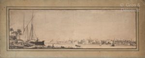 [Dessin]. François-Charles CECILE (1766-1840). Vue du Nil. Lavis d’encre noire et plume signé en bas à droite. Haut : 26 ; Larg. 64 cm. A.B.E (petites rousseurs). François-Charles Cécile a fait partie de l’Expédition d’Egypte. Avec Conté, il a construit un fourneau à réverbère dans les batteries et une pompe à incendie flottante. Devant l’Institut d’Egypte, il présenta un projet de moulin à vent le 1er novembre 1798, mais on lui préféra le projet de Conté. Il fit partie de la commission Fourier pour l’exploration de la Haute-Egypte. Le 5 janvier 1799, avec l’ingénieur Jomard, il mesure, marche par marche, la hauteur de la grande pyramide. De retour en France, il devient professeur de dessin au Conservatoire national des arts et métiers. A sa mort, il est architecte du roi, directeur de la « Machine de Bougival » et chevalier de la Légion d’honneur.